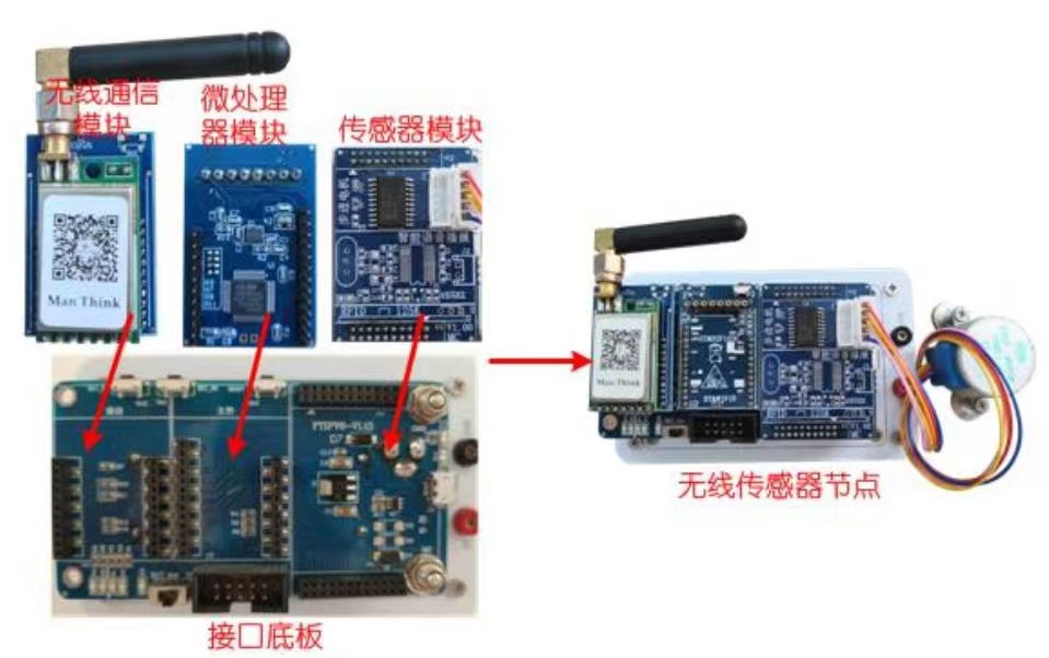 无线传感器节点采用模块化设计,主要由接口底板、无线通信模块、微处理器模块、及传感器调理板组成,通过插针对应连接而成,支持自由组合。Cortex-M3核的微处理器模块自带 OLED 屏显示网络信息、组网状态、以及传感器采样数值。如图所示,展示节点各模块的连接方式。