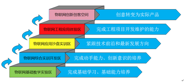 实验室建设的总体发展思路是以“任务引领、项目驱动、创新设计、服务科教”为宗旨,着眼物联网产业链的需求和人才培养的需求,紧密围绕物联网的关键技术,从基础理论与方法、实训平台验证与开发、典型示范应用等三个层次着手,根据“巩固教学、学做同行、学科竞赛、科研创新、毕业设计”的建设目标,按照物联网的三层体系结构,将物联网实验室规划为“基础教学实验区、 物联网综合实训开发区、物联网应用沙盘实训区、创客空间实训区”。
