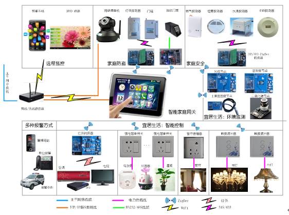 1) 感知设备:主要由传感器调理板、ZigBee通信模块以及接口底板组成,涉及家庭安全类、宜居生活类、家庭安防类的所有传感节点。
