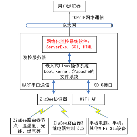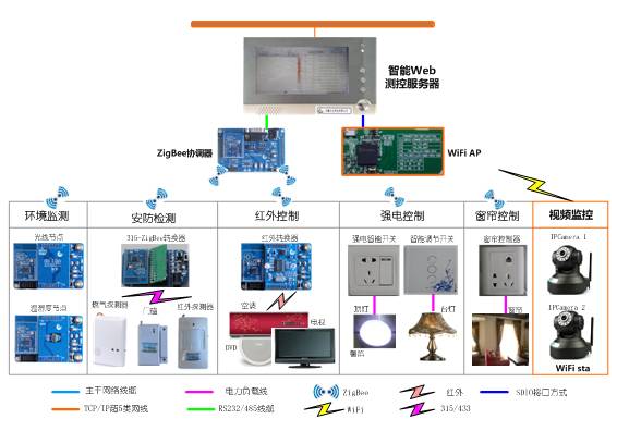 测控服务器内部集成ZigBee无线通信模块,可设计为ZigBee协调器或路由器,ZigBee网络拓扑模式灵活多变。