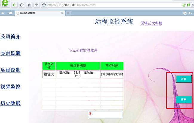 系统既支持局域网客户端访问,也支持外网客户端访问。外网用户只需在浏览器中输入测控服务器的域名地址“http://fttech.eicp.net:81”即可实现远程访问现场,查看节点的实时监测数据、存储的历史数据、设备控制、以及视频监控等。