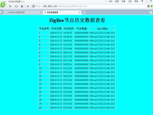 在测控服务器中构建Sqlite数据库以及节点信息表,实时保存温湿度传感器、光线传感器的采样值,所有监测的历史数据都可以显示在客户端浏览器的页面上。