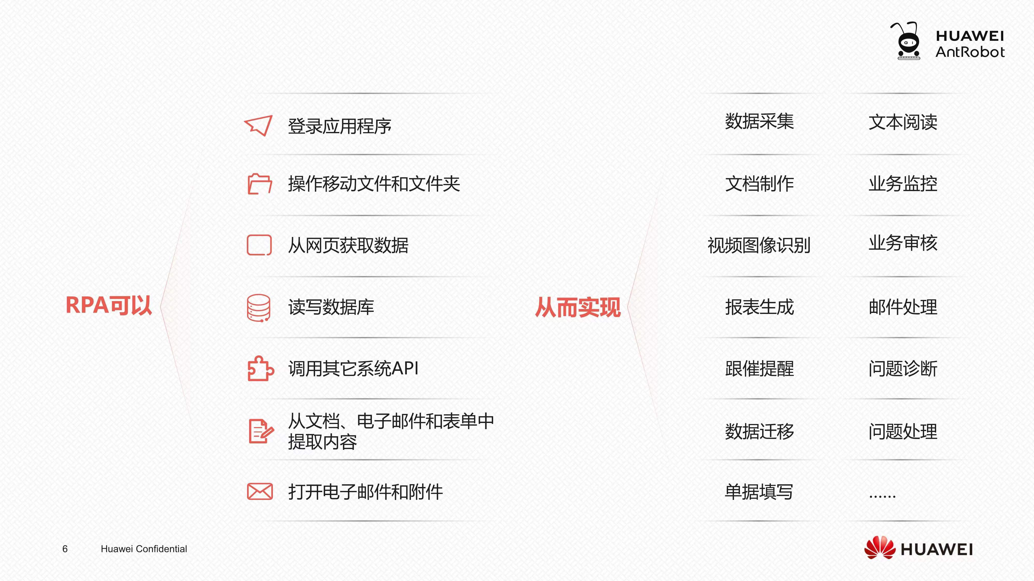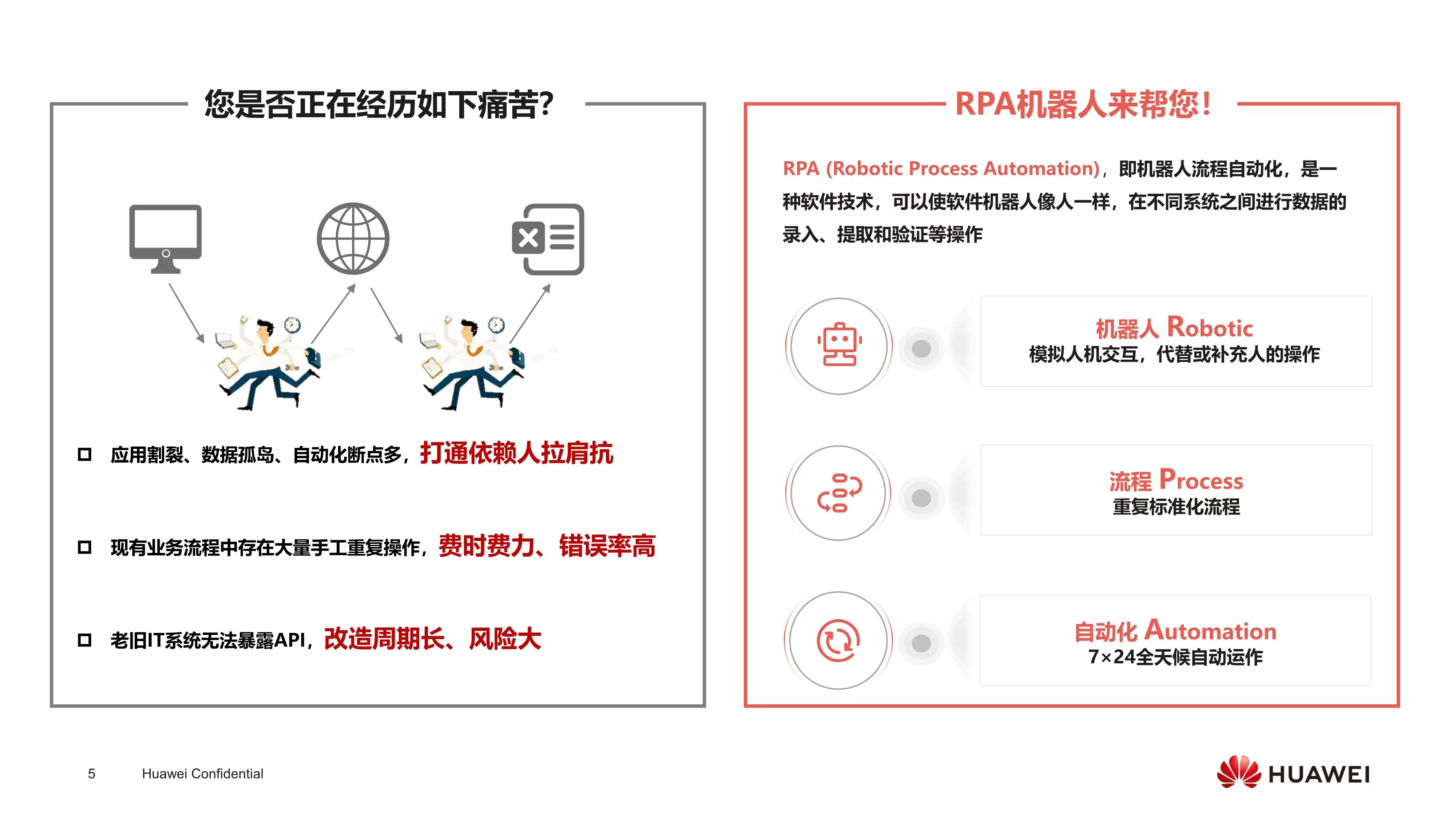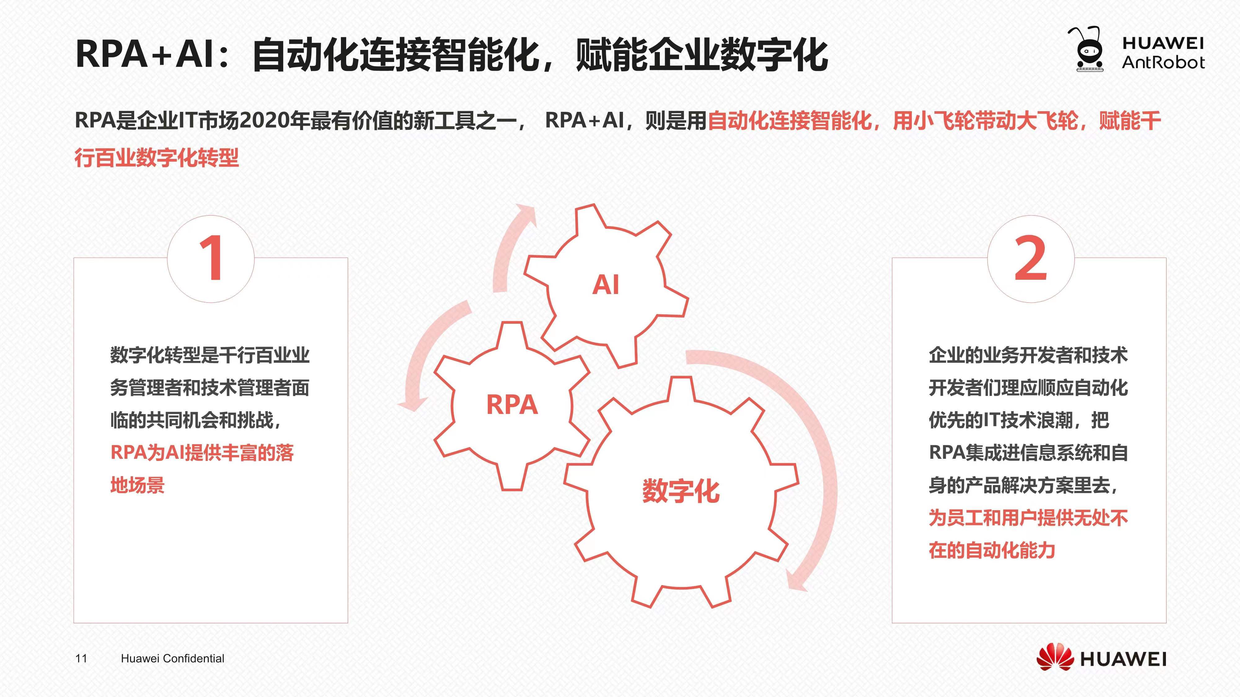 RPA(Robotic Process Automation),翻译为机器人流程自动化,或称为数字化劳动力(Digital Labor),是一种智能化软件,通过模拟并增强人类与计算机的交互过程,实现工作流程中的自动化。RPA具有对企业现有系统影响小、基本不用编码、实施周期短、而且对非技术的业务人员友好等特性,RPA不仅可以模拟人类,而且可以利用和融合现有各项技术如规则引擎、光学字符识别、语音识别、虚拟助手、高级分析、机器学习及人工智能等前沿技术来实现其流程自动化的目标,该技术能够加快产品和服务的上市速度,降低成本并释放员工能力,正成为企业数字化转型的重要途径。目前已有多家公司投入研制成了新一代的RPA机器,我们今天要介绍给大家的,就是华为公司自己生产的RPA。