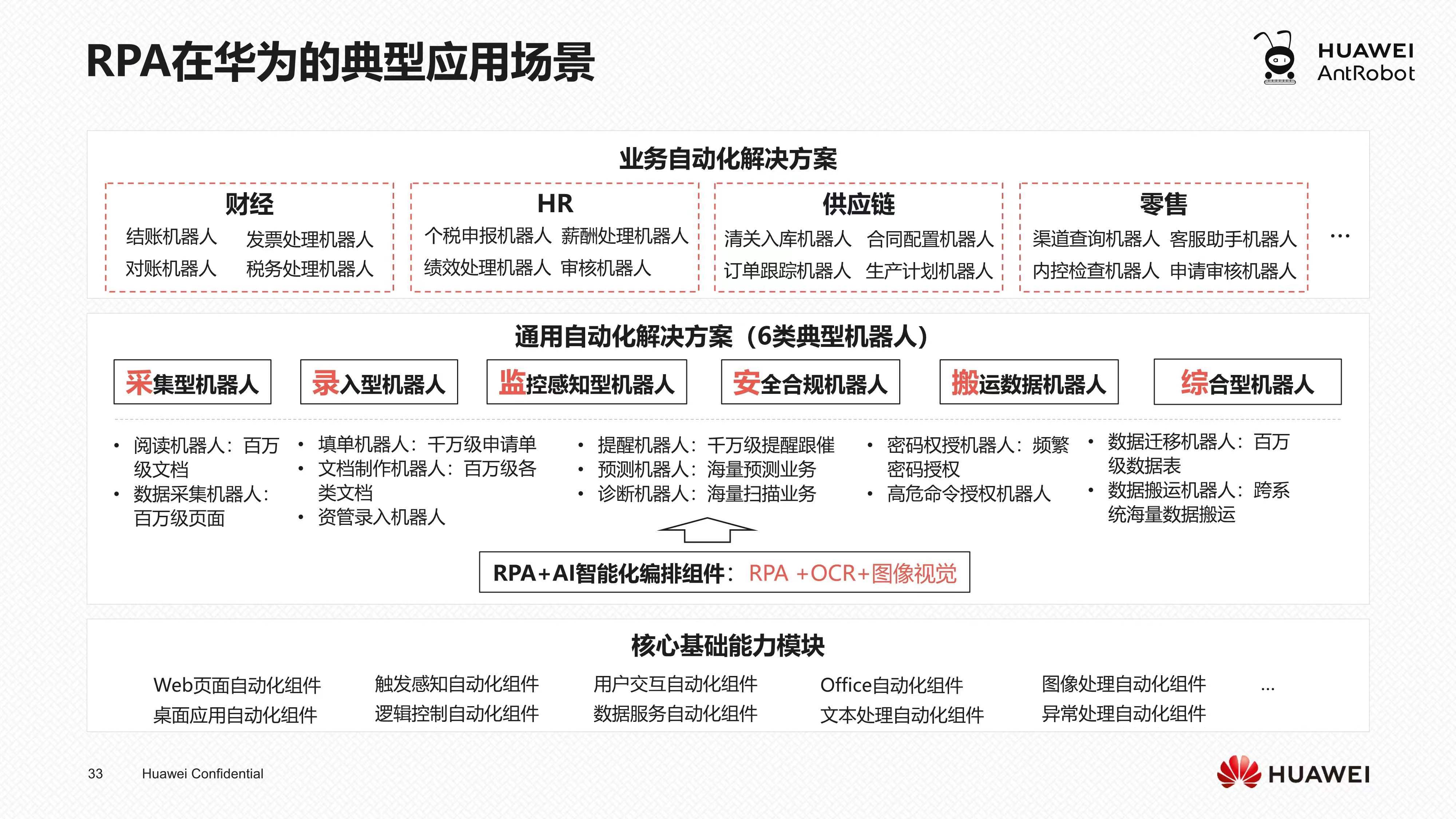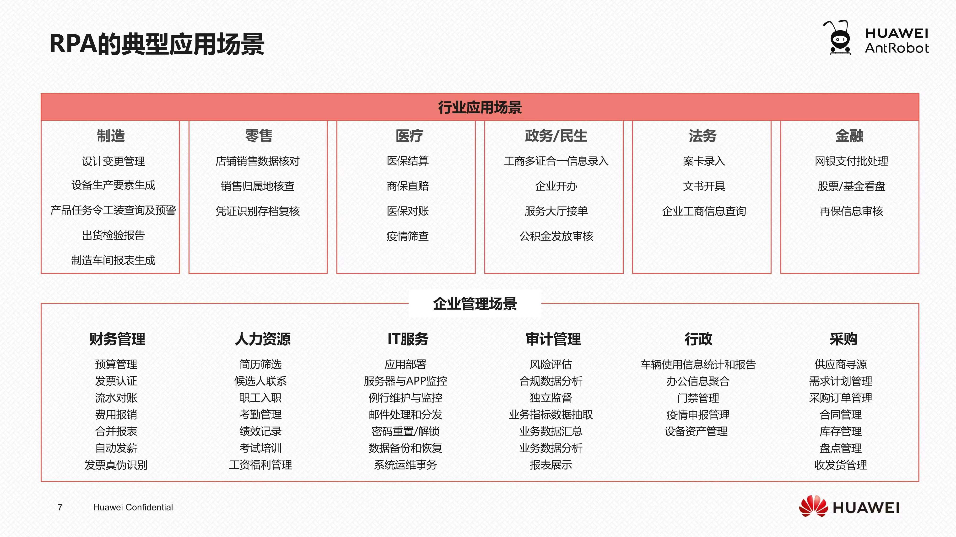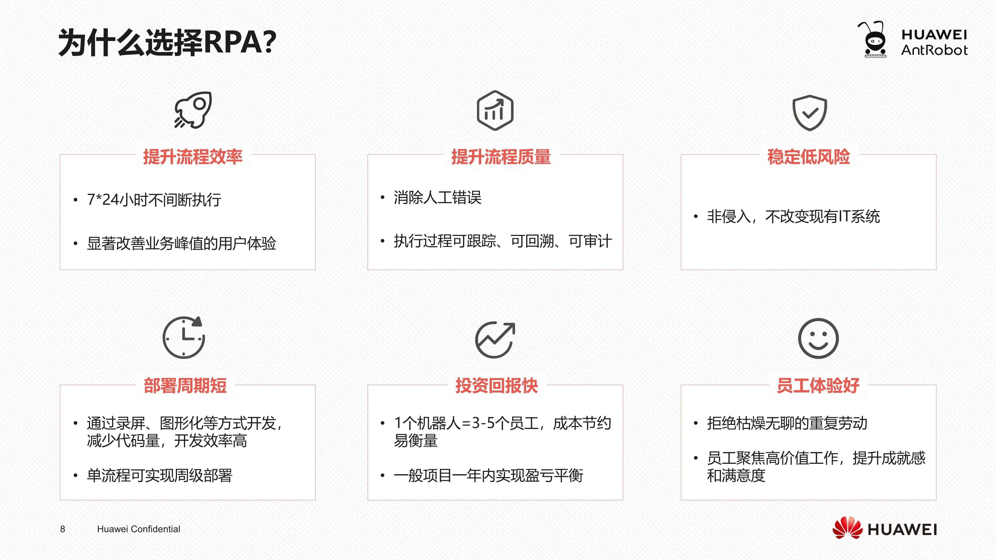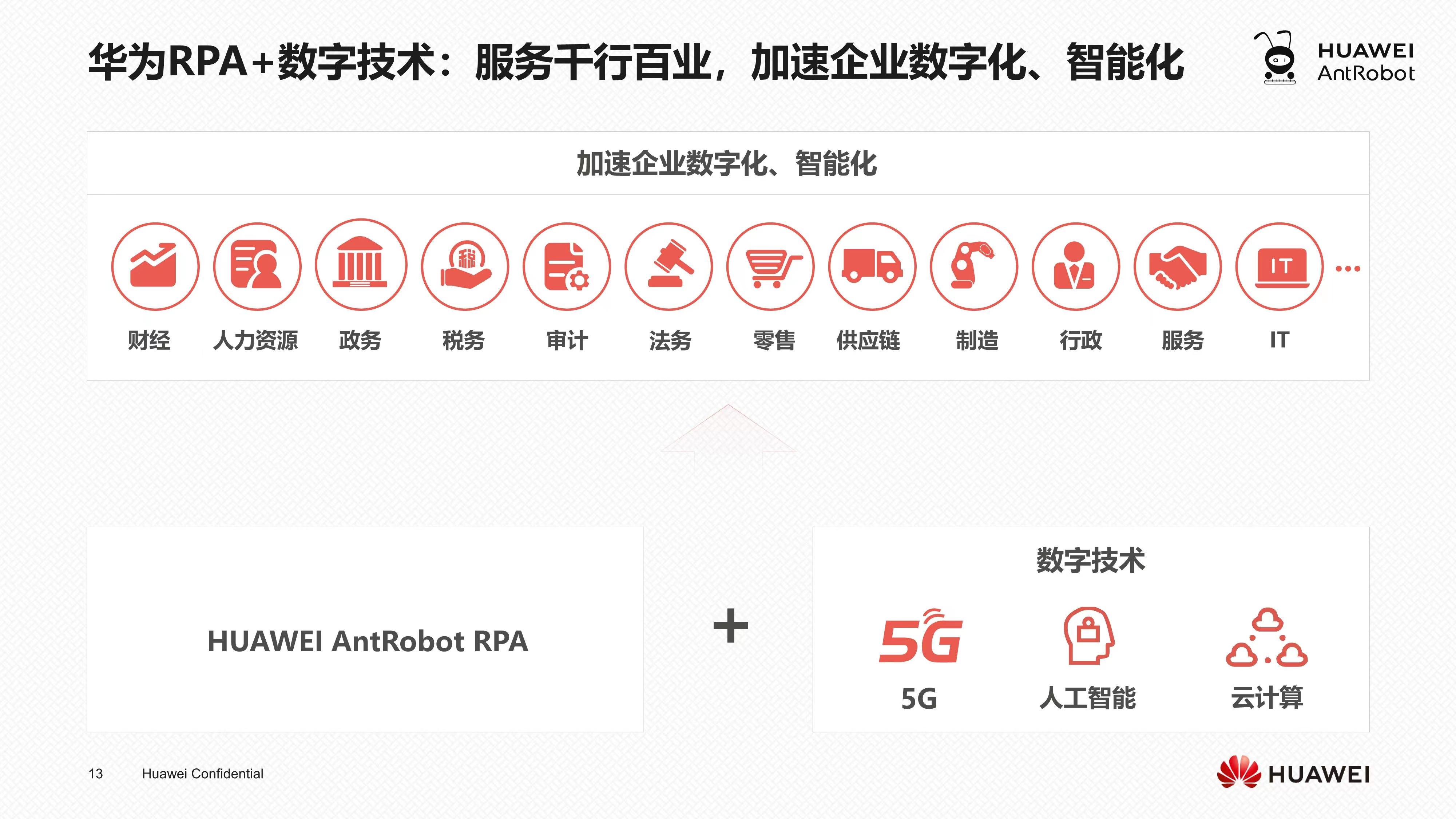 RPA(Robotic Process Automation),翻译为机器人流程自动化,或称为数字化劳动力(Digital Labor),是一种智能化软件,通过模拟并增强人类与计算机的交互过程,实现工作流程中的自动化。RPA具有对企业现有系统影响小、基本不用编码、实施周期短、而且对非技术的业务人员友好等特性,RPA不仅可以模拟人类,而且可以利用和融合现有各项技术如规则引擎、光学字符识别、语音识别、虚拟助手、高级分析、机器学习及人工智能等前沿技术来实现其流程自动化的目标,该技术能够加快产品和服务的上市速度,降低成本并释放员工能力,正成为企业数字化转型的重要途径。目前已有多家公司投入研制成了新一代的RPA机器,我们今天要介绍给大家的,就是华为公司自己生产的RPA。