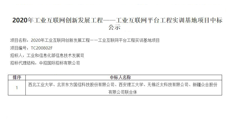 西工大、东方国信、西理工、无锡泛太、众合联合体在激烈竞争中不负众望,中标工信部2020工业互联网全国招标项目。现公示期已结束,感谢各位朋友支持,这是无锡泛太继2019后再次中标,泛太团队还在为下一个目标而奋斗中。