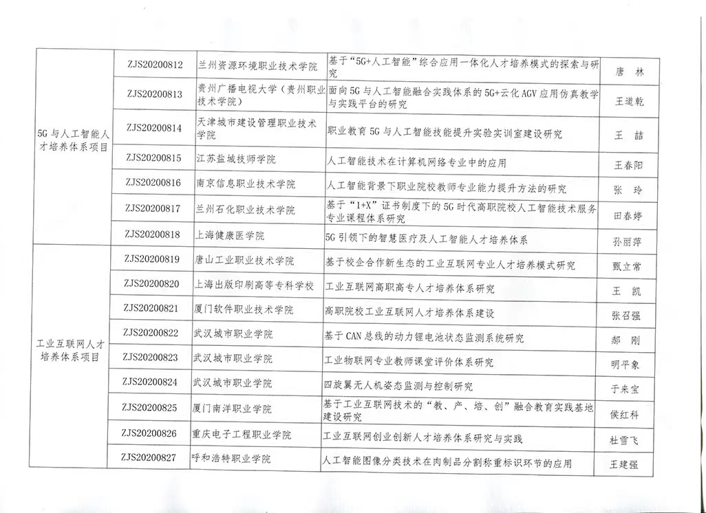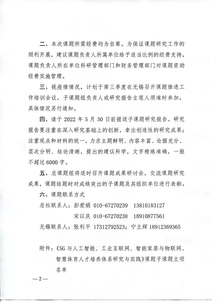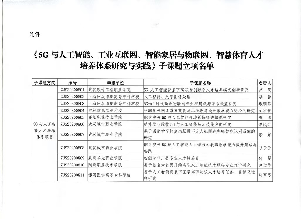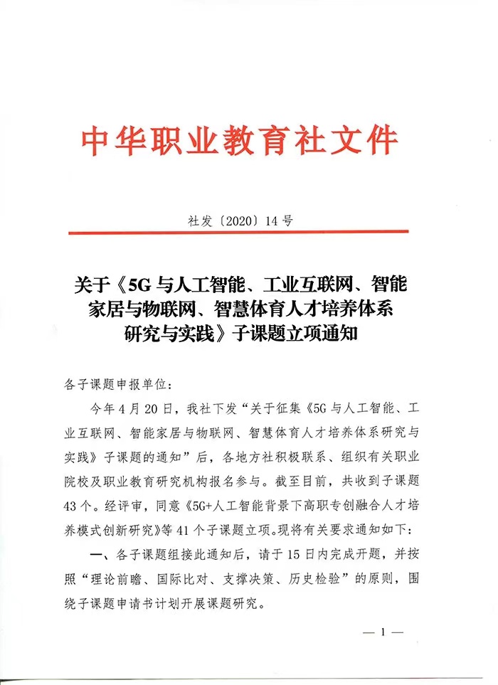 关于《5G与人工智能、工业互联网、智能家居与物联网、智慧体育人才培养体系研究与实践》子课题立项通知