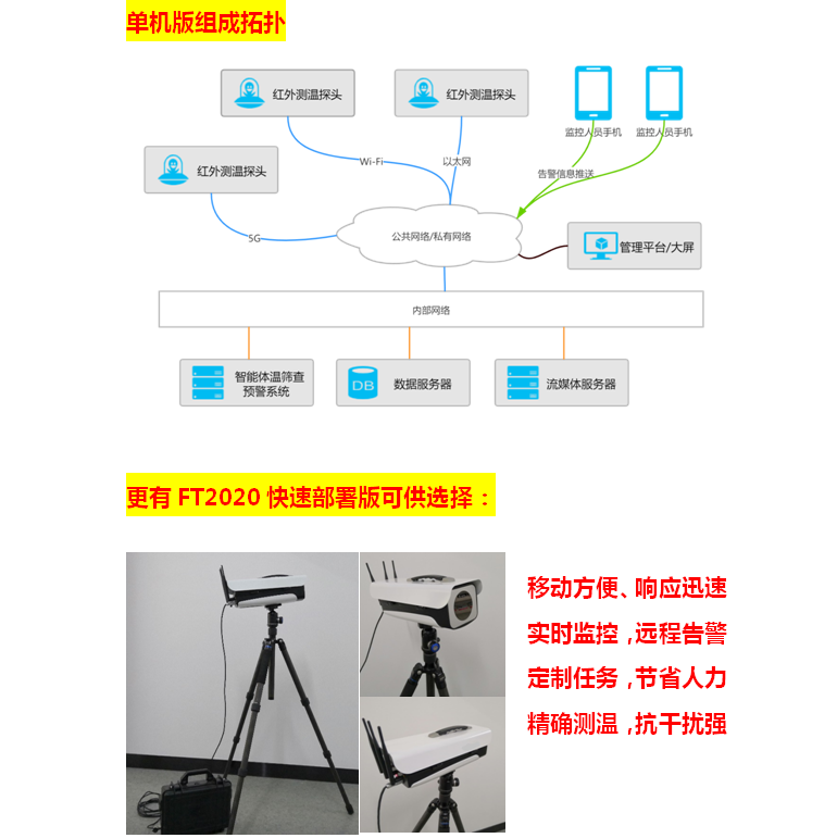 2. 快速部署监控探头,测温探头具备自主筛查与声光报警功能,数据支持4G/5G/Wi-Fi/以太网多种传输方式并入监控网络。
