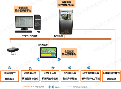 系统采用B/S混合架构,搭载PC服务器、PC客户端、手持机客户端和物联网网关进行信息交互;以低频、高频、超高频RFID设备作为人员和食品信息流通的载体,智能小车作为各个环节的纽带,使用机械手模拟食品流通中的自动化装卸,使用桁车与伸缩装置模拟仓储的出入库,使用智能终端扫描二维码获取食品的溯源信息,结合ZigBee无线传感器网络、嵌入式系统、TCP/UDP网络通信、数据库等物联网关键技术,使食品在整个生产活动始终处于有效监控中,通过RFID电子标签识别技术、移动式可追溯交易终端等技术实现肉菜流通全过程的信息读取、传输与反向识别。