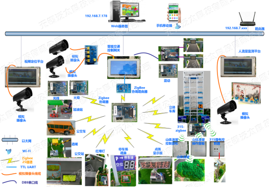 智慧城市交通物联网实训系统(型号:SeaIOT-ITS,如图5)以城市道路交通为原型,融合了无线传感器网络、RFID射频识别、图像识别、无线通信、云计算、M2M中间件等物联网先进技术,依托部署在交通沙盘中的智能车、红绿灯节点、RFID设备、模拟摄像机、网络摄像机、Android网关、图像服务器等设备,实现了智能公交BRT、红绿灯控制、路灯控制、高速ETC、立体停车场、违章抓拍、车牌识别、视频定位、人流量检测、公路灾害智能预警等功能,为物联网专业教学提供了一个完备的应用实训系统。