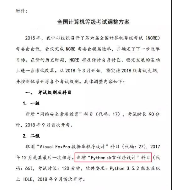 教育部考试中心于 2017 年 10 月 11 日发布了“关于全国计算机等级(NCRE)体系调整”的通知,决定自 2018 年 3 月起,在计算机二级考试加入了“Python 语言程序设计”科目。