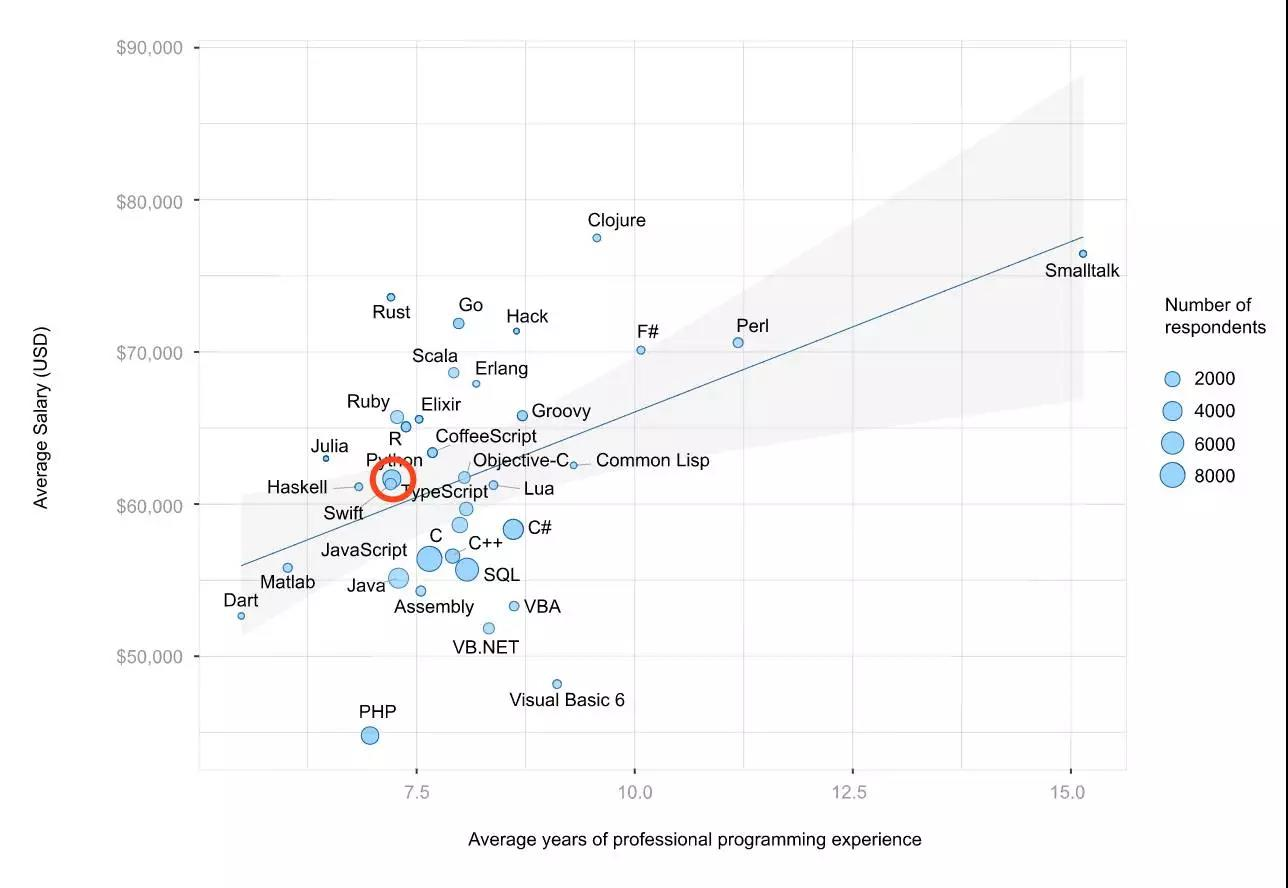 Python 这门语言与其他语言比起来的优势还是很明显的,从薪水图来看,Python 的工作经验要求小于其他主流编程语言,并且平均薪资还是高于 Java / C / PHP /JS 这些主流语言的。