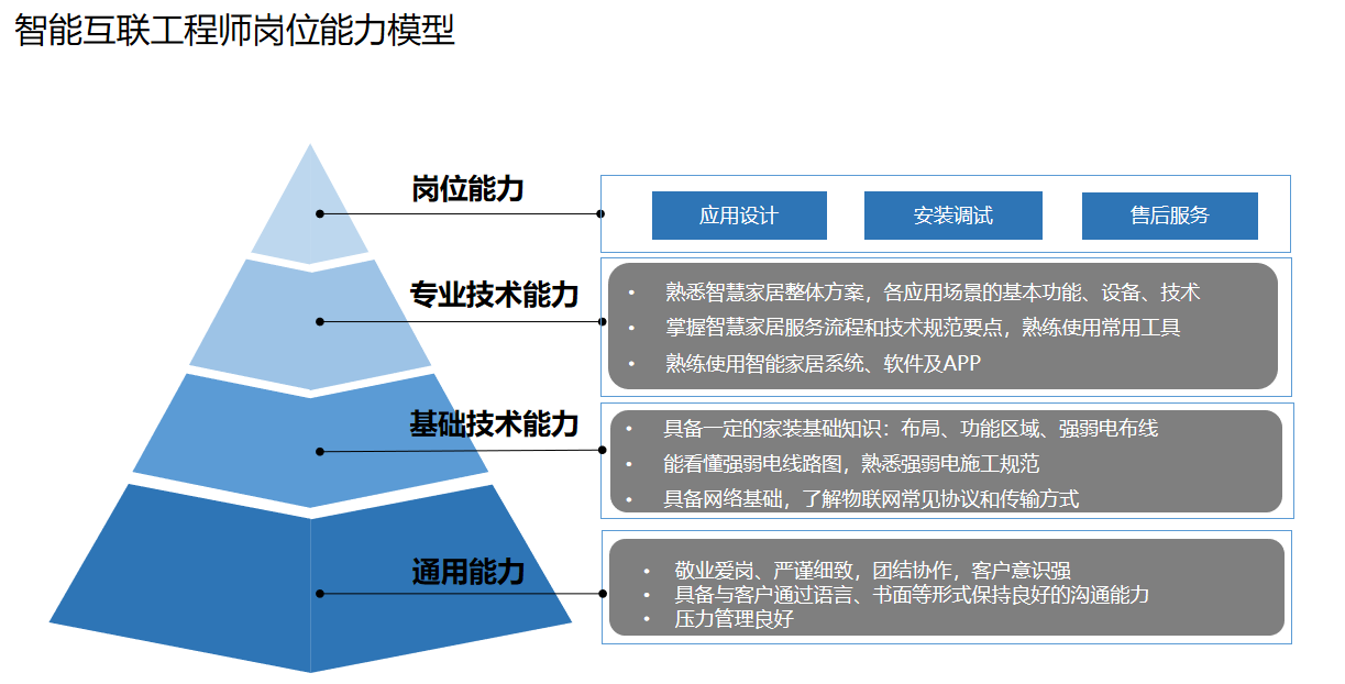 智能家居工程师分为三个级别,分别是智能家居服务工程师(初级)、智能家居应用设计工程师(中级)、智能家居硬件开发工程师(高级)。各个级别的岗位定义,是根据现场工作场景中典型工作任务的难易度来确定的。