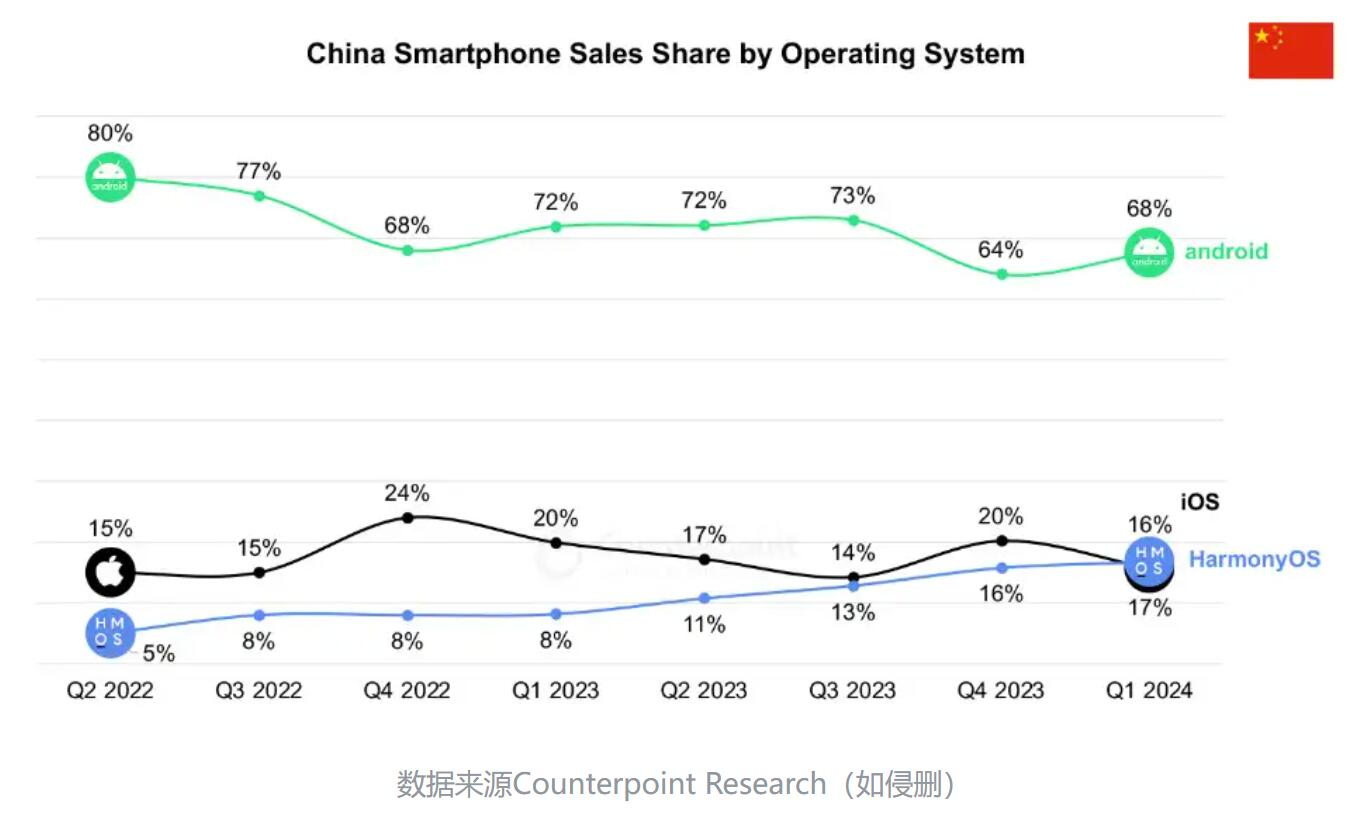 日前,据权威调查机构统计,华为鸿蒙系统在中国市场的份额由2023年一季度的8%飙升至2024年一季度的17%,首次超越苹果iOS,荣登中国第二大手机操作系统的宝座,这一数据反映了鸿蒙系统在国内成为仅次于安卓系统的第二大操作系统。