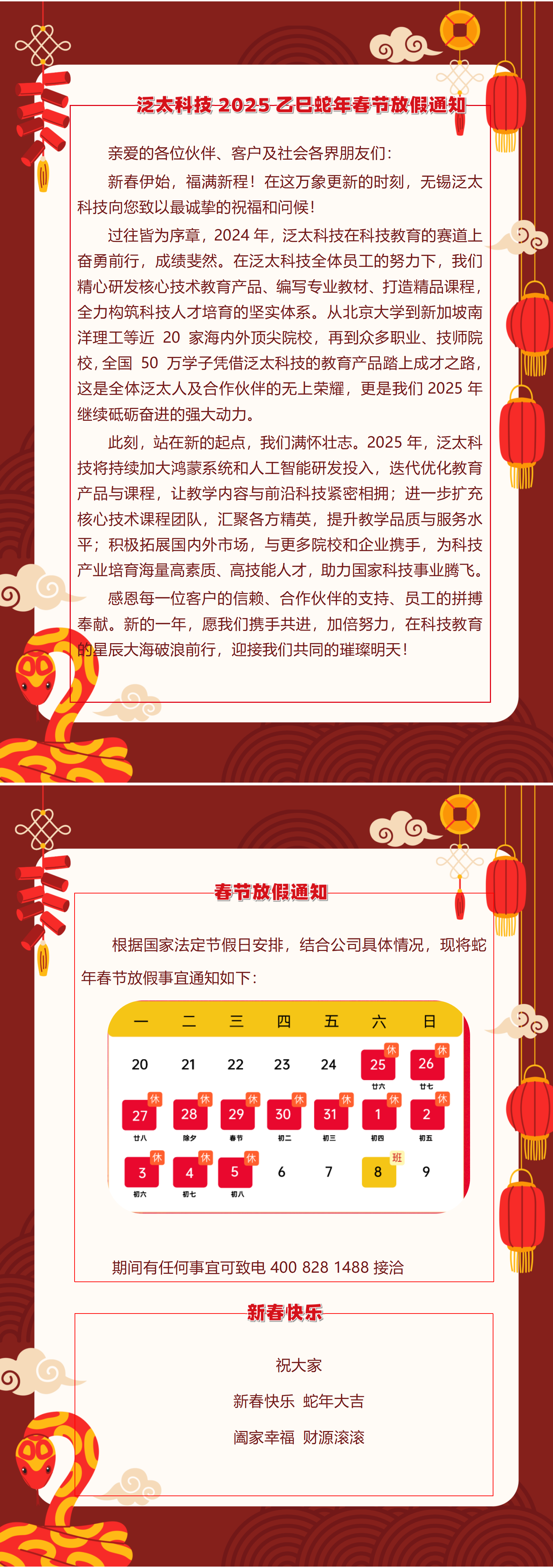 泛太科技2025乙巳蛇年春节放假通知