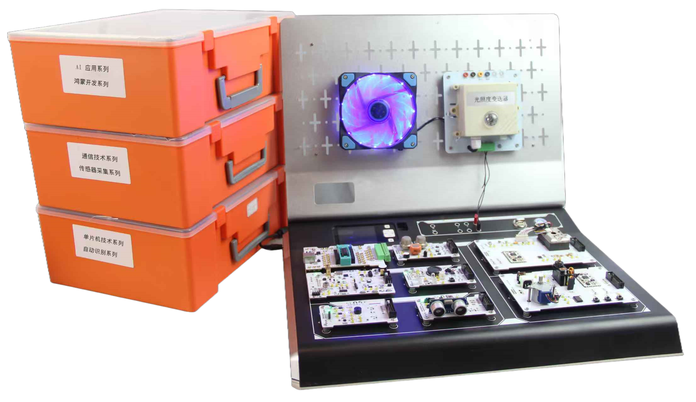 配套教学资源中,AI 应用版块涵盖数据预处理、特征工程、模型训练与部署等实验,例如基于传感器采集的温湿度数据训练异常预警模型,通过上位机软件实时展示模型推理结果;或结合自动识别模块的指纹识别、条码识别数据,开发身份认证、物品分类等 AI 小应用,让初学者直观感受 AI 技术的实际价值