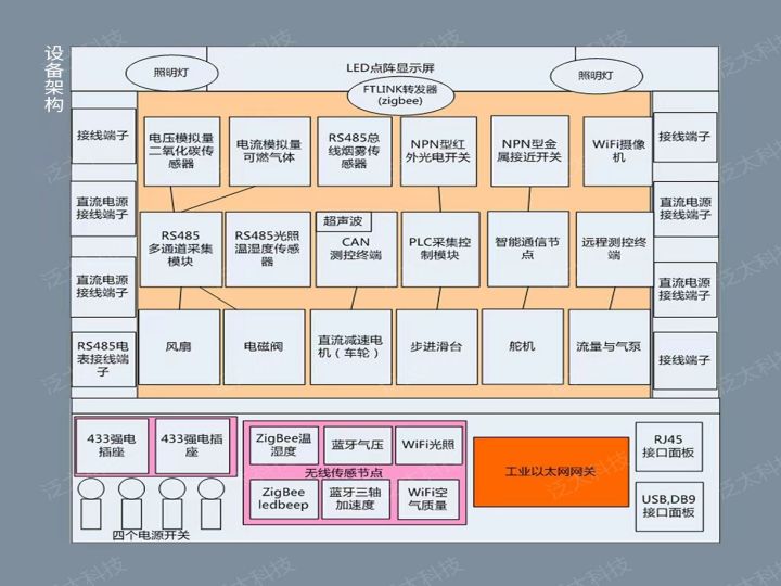 实训台支持0-5V/0-10V/4-20mA/0-20mA模拟量、开关量、数字量等常用工业信号采集;集成CAN、RS485工业现场总线和工业以太网络,支持ModbusRTU、ModbusTCP协议;包含ZigBee、WiFi、BlueTooth短距离和LoRa、NB-IoT、LTE远距离无线传感网络;集成工业以太网网关,具有ModbusRTU、CAN、无线传感网等异构网络协议解析功能,支持ModbusTCP工业以太网协议,可通过MQTT、CoAP、HTTP物联网协议接入工业物联网云服务平台;支持云服务平台本地化部署或云端部署,提供API二次开发接口。提供基于智慧工厂、智慧城市、车载控制、危化品等行业的数据采集监控系统的嵌入式开发、Android应用开发、Web应用开发、标识解析实训案例。实训台主要由工业以太网网关、无线传感节点区、网孔实训区、以及台体框架(含电源接线端子、传感器接线端子、通信接口面板等)组成。