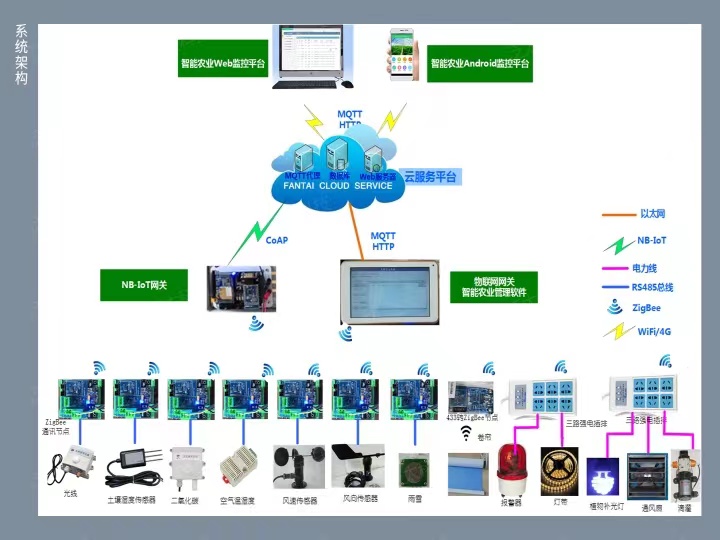 系统定时采集大棚内空气温湿度、光照度、土壤湿度、二氧化碳浓度等数据,经过无线传感网传送给物联网网关。系统会在环境参数超过预设值时进行联动处理,如控制通风扇、补光灯、滴灌、遮阳帘等执行器,调整大棚内环境或提前预警。系统将农业环境信息通过以太网、移动网络或窄带广域网传送给农业云服务平台进行存储、统计分析,以WEB页面集中展示农业生产环境的实时数据、趋势走向、设备状态等。同时,系统支持视频采集,用户可通过物联网网关、移动终端浏览农业现场视频。