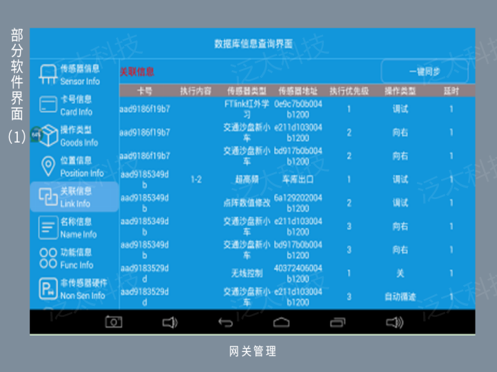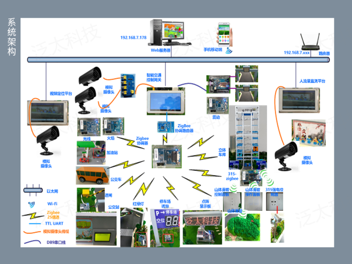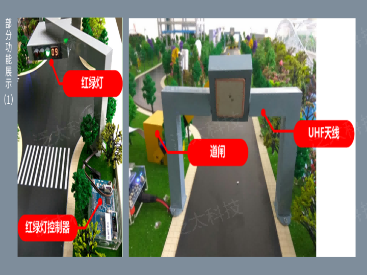 以城市道路交通为原型,融合了无线传感器网络、RFID射频识别、图像识别、无线通信、云服务、M2M中间件等物联网先进技术,依托部署在交通沙盘中的智能车、红绿灯、公交站、RFID设备、模拟摄像机、网络摄像机、Android网关、图像服务器等设备,实现智能车、红绿灯控制、公交站自动播报、路灯控制、智能停车场、违章抓拍、车牌识别、人流量检测、公路灾害智能预警等功能,为物联网专业教学提供了一个完备的应用实训系统。