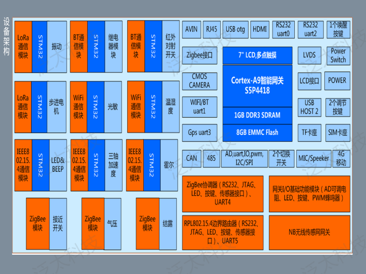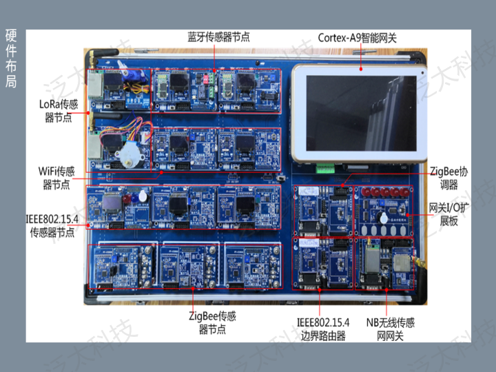 SeaIOT-B-WSN-2A型无线传感网全功能实验箱是SeaIOT-B-WSN-02型的升级版,集成Bluetooth、WiFi、IEEE802.15.4、ZigBee等短距离无线通信技术,将6LowPAN(IPv6)互联网协议应用到短距离无线通信网络中,与ZigBee使用的ZStack协议栈并存,支持双协议栈;集成LoRa、NB-IoT等长距离无线通信技术,自定义传感网协议,CoAP应用协议,实现主从机组网应用,平台接入应用。采用三星Cortex-A9 S5P4418四核处理器作为智能网关,支持6LowPAN、Z-Stack、自定义传感网协议等多协议解析,具有1GB内存、8GB大容量存储空间、7寸电容触摸显示屏、丰富的外围接口,可板载GPS定位、WIFI/BT二合一通讯、4G移动通讯等多种模块,内嵌Android、Linux双系统,可一键切换。