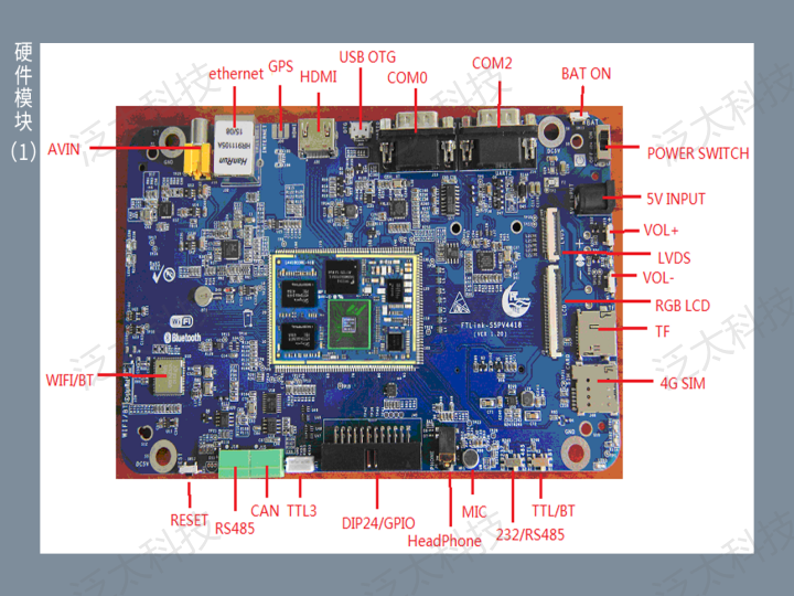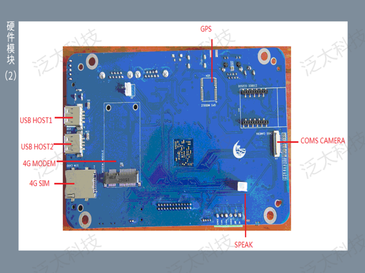 该产品采用ARM架构三星四核处理器S5P4418,具有7寸LCD显示屏,集成4G移动通信模块、WiFi/BlueTooth二合一通信模块、GPS卫星定位模块、ZigBee传感网模块,板载CAN/RS485总线接口、丰富的外设接口以及扩展模块。