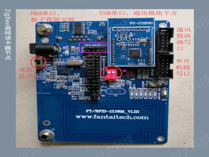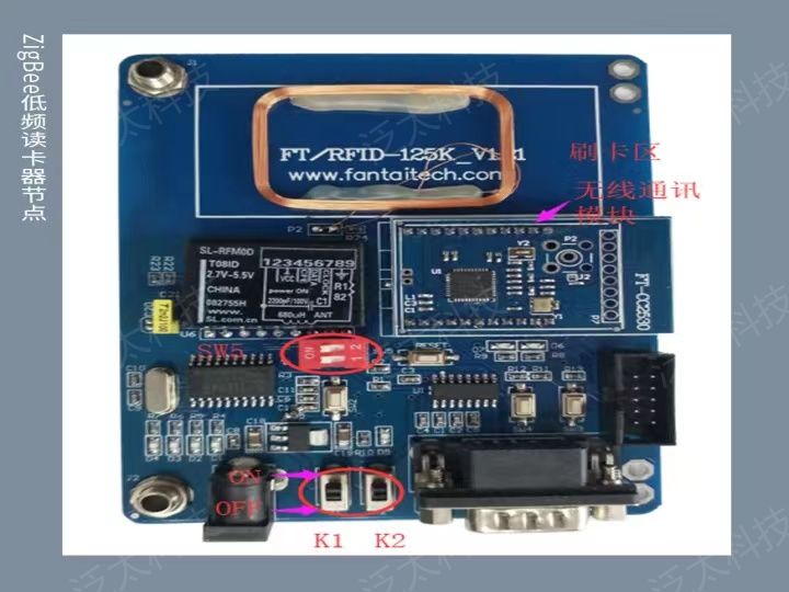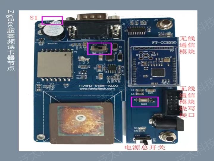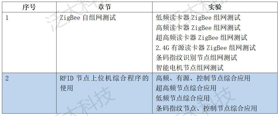 该产品包含125KHz低频模块、13.56MHz高频模块、915MHz超高频模块、2.4GHz有源读写模块、条码指纹节点、智能电机控制节点、以及ZigBee协调器。实验课程重点放在对各个频段RFID模块的管理、控制和上位机程序的应用开发上,学生可以利用开放的通信协议,使用上位机编程语言(C#)编写上位机应用程序与RFID模块、二维码指纹识别节点、智能控制板进行数据交互,实现各种物联网应用场景。产品外观如图所示。