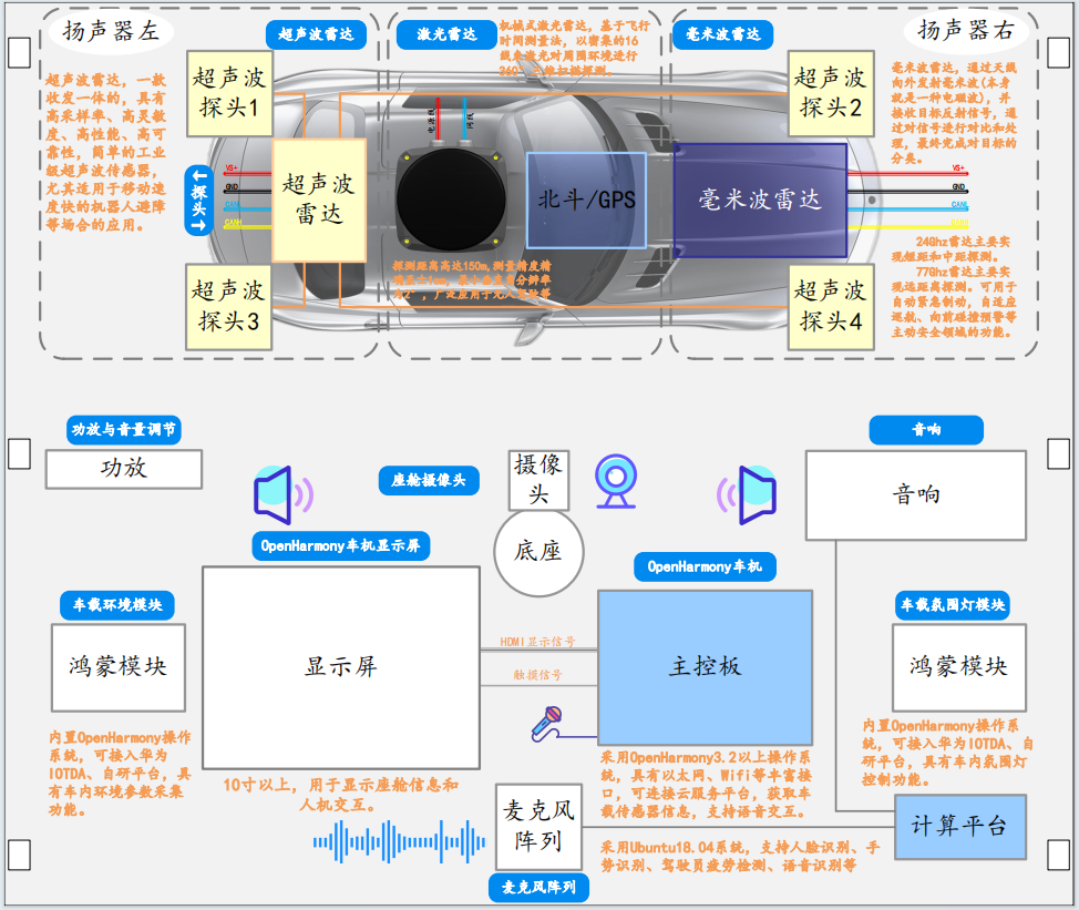 平台包含中控计算平台系统、鸿蒙车机及其显示器、视觉传感器、麦克风阵列、音响设备、座舱舱体(含座椅、雨刮、车窗、方向盘、刹车踏板、加速踏板)、超声波雷达、毫米波雷达等硬件,结合中控软件系统、鸿蒙车机软件、座椅控制程序,实现手势识别、人脸识别、语音交互、驾驶员疲劳驾驶检测、鸿蒙座椅远程调节、雨刮车窗控制、车载传感器监测、车机应用娱乐等功能。